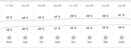 Lembra que o Simepar estava prevendo temperatura de 40 graus para os próximos dias em Campo Mourão? Esqueça. Mudou. Agora a previsão é de 41 graus para o domingo, dia 24. Sem contar que para quinta, sexta e sábado os termômetros devem chegar a 39 graus. Se serve de "consolo", no Climatempo a previsão é de temperaturas mais "amenas". A máxima fica "só" em 40 graus, para o próximo sábado...