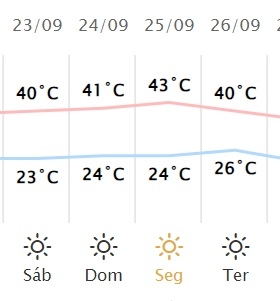 É o que está prevendo o Simepar para a próxima segunda-feira. A previsão é de uma forte onda de calor durante a semana. Chega a 40 graus no sábado, vai a 41 no domingo e alcança os 43 na segunda, dia 25. Depois cai para 40 na terça. No Climatempo é a previsão também é de calorão nos próximos dias, mas a máxima fica "só" em 39 graus, no domingo.