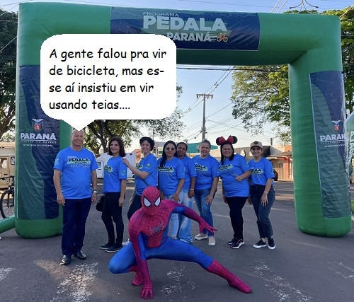 O clic é de Altamira do Paraná, que oficializou, domingo, a rota do programa Pedala Paraná. Cerca de 50 ciclistas participaram, percorrendo um trecho de 25 km. O prefeito José Etevaldo Branco prestigiou o evento. Repare que até o Homem-Aranha deu uma passadinha por lá, com direito a pose e tudo...