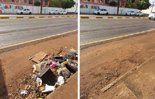 "Antes e depois. Já que os órgãos competentes que deveriam fazer não o fazem, moradora retira lixo na perimetral Tancredo Neves".