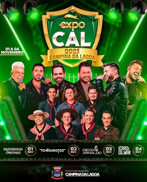 Saiu a programação da Expocal, que voltará a ser realizada como parte das comemorações de aniversário de Campina da Lagoa. Será de 1 a 4 de novembro. A atração principal, dia 1, será a dupla Matogrosso & Mathias. Depois vêm, pela ordem, Tchê Garotos, Diego & Arnaldo e Ícaro & Gilmar. A entrada será sempre franca.