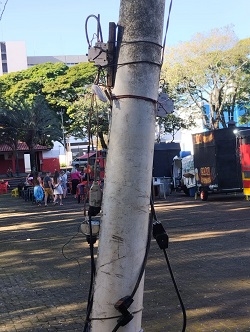 "Campo Mourão deseja fazer da cidade um pólo tecnológico, porém não cuida das fiações da praça São José, colocando crianças e demais pessoas em risco. Detalhe: Protocolos já foram abertos solicitando providências, porém o setor responsável não toma providências, inclusive com pedido de vereadores. Talvez após algum acidente tomem providências".