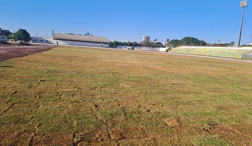 O estádio Roberto Brzezinski, de Campo Mourão, está com gramado novamente. Ainda não para para jogar bola, claro, mas a grama já foi toda colocada pela empresa que venceu a licitação. Custou R$ 84,4 mil. O gramado anterior teve de ser retirado para que o terreno fosse nivelado para a construção da nova pista de atletismo. O desnivelamento só foi descoberto quando foram iniciadas as obras da pista, que está sendo feita por R$ 2,3 milhões.
