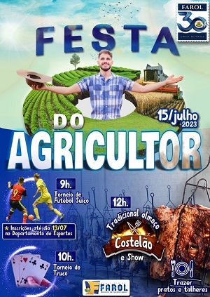 Farol - A prefeitura confirmou para o próximo dia 15 a Festa do Agricultor. Haverá torneios de futebol suíço e de truco, além de costelão e shows. Inscrições até o dia 13 no Departamento de Esportes.