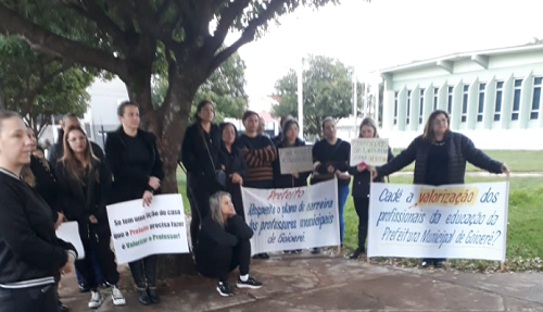 Um grupo de professores da rede municipal realizou protesto nesta segunda-feira em frente à prefeitura de Goioerê. Eles usaram roupas pretas e mostraram cartazes pedindo valorização. O principal pedido é sobre o piso do magistério. Na semana passada professores discutiram o assunto em assembleia e não descartaram paralisação após o recesso de julho.