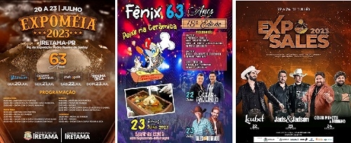 Moreira Sales - A Expo-Sales vai de sábado a segunda-feira, com shows e rodeio. Vão se apresentar Loubet (sábado), Jads & Jadson (domingo) e Cesar Menotti & Fabiano (segunda).