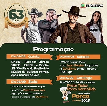 Saiu a programação de aniversário de 63 anos de Barbosa Ferraz. Será de 7 a 10 de setembro, incluindo shows com Pedro Paulo & Alex (dia 8) e Luan Pereira (dia 9). No encerramente acontece a Festa do Porco Garantido, o prato típico do município. A programação também contará, na abertura, com desfile de crochê, afinal, Barbosa Ferraz é, por lei, a capital paranaense do crochê.