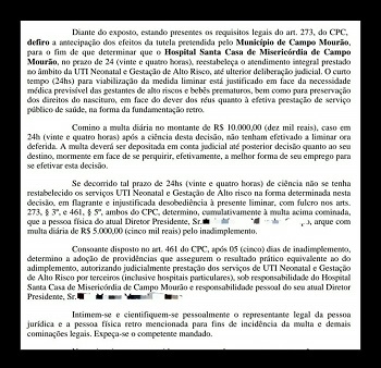 Correu solto por redes sociais, neste fim de semana, a cópia de uma decisão judicial contra a Santa Casa de Campo Mourão. No print, o nome do presidente é apagado. Pudera. Trata-se de uma decisão antiga, de 2014, já arquivada, nada a ver com o atual momento. Só que muita gente compartilhou achando que era notícia "quente". A Santa Casa chegou a divulgar neste sábado uma "Nota de esclarecimento" e chamou o caso de "prática irresponsável".