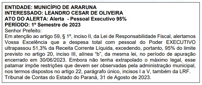 Segundo publicação do Tribunal de Contas do Estado, nesta segunda-feira, a prefeitura encerrou o primeiro semestre de 2023 compromentendo acima de 51,3% da receita corrente líquida com a folha de pagamento. "Embora não tenha extrapolado o máximo legal, esse patamar impõe restrições que devem ser observadas pela administração municipal, destaca o TC. O município também foi alertado por que apresentou resultado orçamentário deficitário no período de encerrado em 30 de junho.