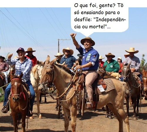 O clic é da 2ª Cavalgada dos Amigos, que aconteceu domingo, em Goioerê. A realização foi da Comitiva 100 Destino, com apoio da prefeitura. O prefeito Betinho Lima participou, com direito a pose de d. Pedro I na hora do "grito do Ipiranga". Em tempo: município fará desfile do Dia da Independência, nesta quinta-feira (8h), na av. Daniel Portela.
