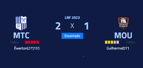 Campo Mourão perdeu para o Minas por 2 a 1, nesta quarta-feira, em Belo Horizonte, pela Liga Nacional de Futsal.