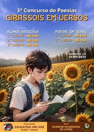 A escola São José, de Peabiru, abriu inscrições para o 3º Concurso de Poesias "Girassóis em Versos". São duas categorias - uma para alunos da escola e outra para a comunidade em geral. A inscrição é gratuita e pode ser feita até o próximo dia 15. O tema é livre, mas a poesia deve ser inédita e mencionar, nem que seja uma vez só, a palavra "girassol" (girassóis também vale).