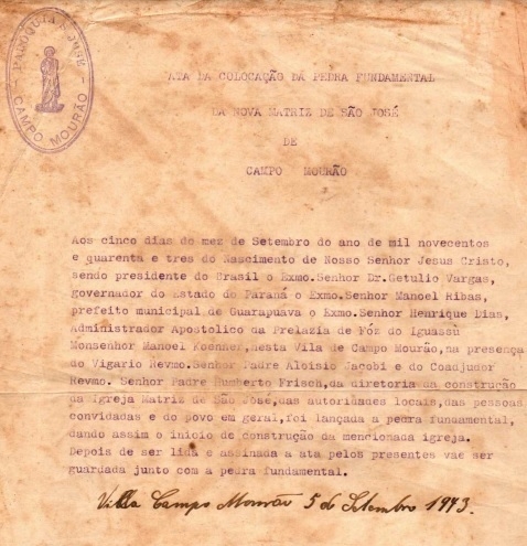 Completou 80 anos, nesta terça-feira, que foi lançada a pedra fundamental para a construção da "nova" matriz de São José, em Campo Mourão. Tudo registrado em ata assinada em 5 de setembro de 1943. O documento destaca que o presidente do Brasil era o "Dr Getúlio Vargas", o governador do Paraná Manoel Ribas e o prefeito de Guarapauva, Henrique Dias. Campo Mourão, que ainda pertencia a Guarapuava, era chamada de "vila".