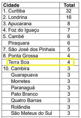 O Ministério Público divulgou nesta terça-feira o balanço das mortes em confronto com a polícia, no Paraná, no primeiro semestre deste ano. Foram 158 em 50 municípios. Houve redução de 37,8% em relação ao mesmo período do ano passado. Da região, apenas uma cidade aparece na lista. É Terra Boa, com quatro mortes em confronto com a PM. O município ocupa o oitavo lugar no Estado.