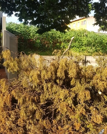 Rua Pitanga, árvores foram podadas e ramos já secos seguem na calçada, com pedestres tendo de passar pela rua. Olha o terreno do fundo, cadê o controle da dengue?