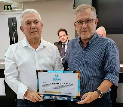 O ex-prefeito de Campo Mourão, Tauilo Tezelli, participou como “convidado especial” da reunião da Acicam nesta quarta-feira à noite. Recebeu homenagem da Associação Comercial pelos serviços prestados à cidade, com direito a placa e tudo entregue pelo presidente Francisco Viudes.