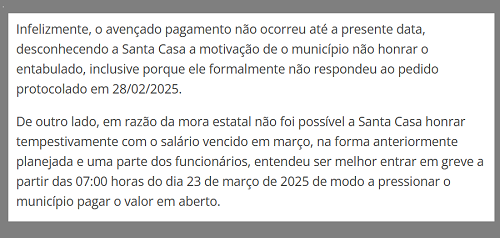 O texto diz que o município ficou de repassar R$ 1,2 milhão até 10 de março, o que não aconteceu.