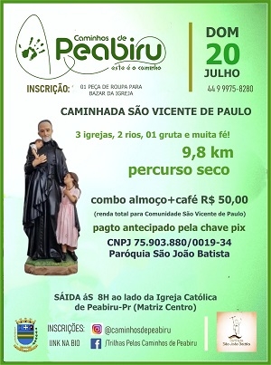 Acontece no próximo dia 20, em Peabiru, a Caminhada São Vicente de Paulo. O percurso é de 9,8 km e vai da Igreja Matriz até a comunidade de Placa União. A inscrição é gratuita, mas pede-se a doação de uma peça de roupa em bom estado. Há opções de café da manhã (R$ 20) e almoço (R$ 40), com o combo a R$ 50. Para o retorno haverá ônibus gratuito.