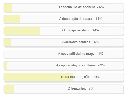 “O que você mais gosta no Natal de Campo Mourão?” Enquete encerrada neste domingo deu vitória à alternativa “Nada me atrai, não”, com 45% dos votos (cadê o espírito natalino, gente?!). O “cortejo natalino” teve 24% e a “decoração na praça” 11%. Depois veio o “trenzinho”, com 7%. O resultado completo está no quadro acima.
