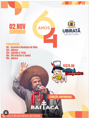 Ubiratã -A prefeitura confirmou para o dia 2 de novembro, a Festa do Leitão à Campestre. O prato típico será servido dentro da programação em comemoração pelos 64 anos do município.