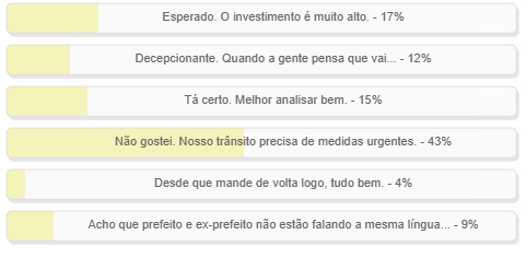 “O que você achou do pedido do prefeito de retirar o Plano de Mobilidade Urbana da Câmara?” Enquete com essa pergunta foi encerrada neste domingo. Vitória da alternativa “Não gostei. Nosso trânsito precisa de medidas urgentes”, com 43% dos votos. “Esperado. O investimento é muito alto” teve 17% e, “Tá certo. Melhor analisar bem”, 15%. O resultado completo está no quadro acima.