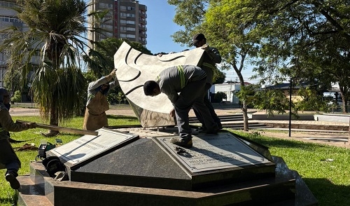 O monumento do Pró-Solo, obra do artista Fernando Calderari, criada em 1976, já está novamente instalado na Praça do Fórum, em Campo Mourão. A peça retornou ao local na tarde desta sexta-feira, antes do prazo inicialmente previsto. O monumento havia sido cedido temporariamente para integrar a exposição “Calderari: Amar, além do mar”, realizada no Museu Alfredo Andersen, em Curitiba.