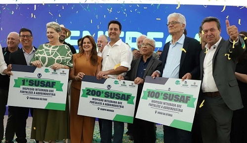 Campo Mourão é a 200ª cidade a aderir ao Sistema Unificado Estadual de Sanidade Agroindustrial Familiar, Artesanal e de Pequeno Porte (Susaf). A oficialização da cidade na lista de municípios que integram o programa de inspeção sanitária ocorreu nesta segunda-feira, no Palácio Iguaçu, em Curitiba. Entre os presentes, o governador Ratinho Jr, o secretário de Estado Marcio Nunes (Agricultura e Abastecimento) e a vice-prefeita Fátima Nunes.