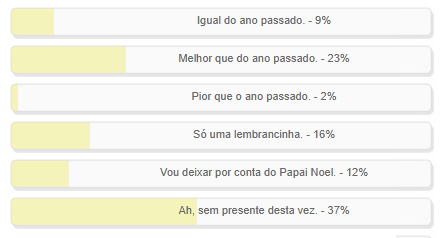 “Como vai ser o presente de Natal que você dará este ano?” Enquete encerrada neste domingo não foi muito otimista, não. Venceu a alternativa “Ah, sem presente desta vez”, com 37% dos votos. “Melhor que o do ano passado” ficou em segundo, com 23%. Em seguido veio “Só uma lembrancinha”, com 16%. O resultado completo está no quadro acima.