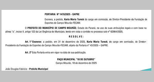Portaria publicada nesta quinta-feira trouxe a exoneração, a pedido, da presidente da Fundação de Esportes de Campo Mourão, Karla Tureck.