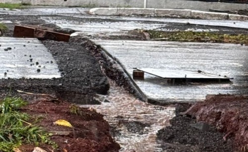 Início da av. Irmãos Pereira, no semáforo com a av. Miguel LUi Pereira. Com o volume de chuvas, o remendo que foi feito ficou danificado e atrapalhou o trânsito no local.
