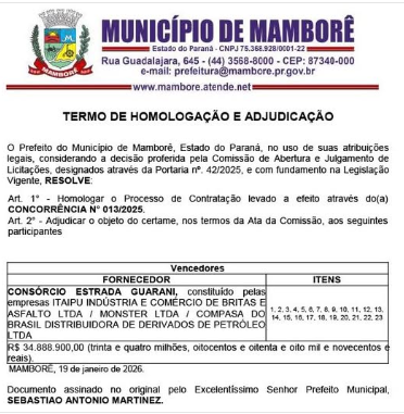 A prefeitura de Mamborê homologou a licitação para construção de asfalto na estrada do Guarani.
