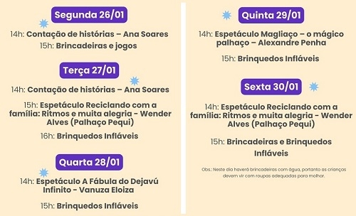 A Biblioteca Municipal de Campo Mourão vai realizar de 26 a 30 deste mês as “Férias na Biblioteca”. Haverá atividades com contação de histórias, espetáculos, brincadeiras e jogos, além de brinquedos infláveis (veja acima). A programação acontecerá nos cinco dias das 14h às 17h.