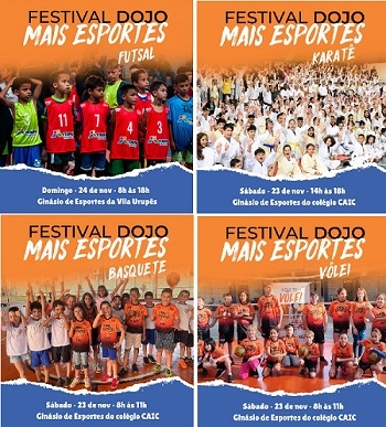 Acontece neste fim de semana, em Campo Mourão, o Festival Dojo Mais Esportes. O evento reunirá as atividades dos núcleos de vôlei, futsal, basquete e caratê da Associação Dojo. No sábado de manhã, no Caic, serão realizadas competições de basquete e vôlei. À tarde, será a vez do caratê. No domingo, no ginásio da Vila Urupês, acontecem as disputas de futsal. O projeto tem o patrocínio do Governo Federal, por meio do Ministério do Esporte.