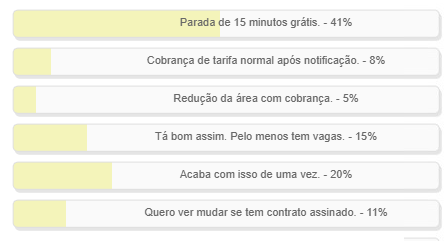 O que devia mudar na Zona Azul de Campo Mourão?” Enquete com esta pergunta foi encerrada neste domingo. A alternativa “Para de 15 minutos grátis” venceu om 41% dos votos. “Acaba com isso de uma vez” ficou em segundo, com 20%. “Tá bom assim. Pelo menos tem vagas” fechou o pódio, com 15%. O resultado completo está no quadro acima.