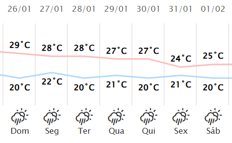 Tá calor, né? Pela previsão do Simepar, a temperatura em Campo Mourão dá uma amenizadinha a partir deste domingo, quando a máxima fica em 29 graus. Na sexta cai para 24 graus (a máxima!). O Simepar também prevê chuva todos os dias da semana. Começa com 3 mm no domingo e chega a 14 mm na sexta-feira.