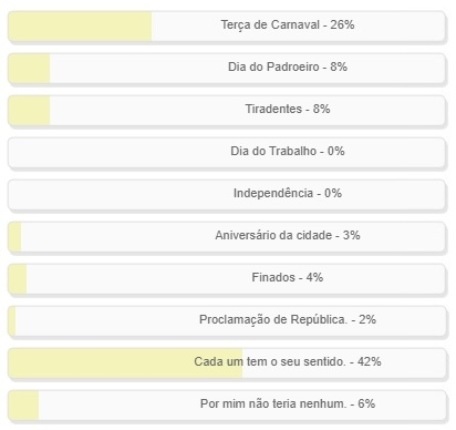 “Qual feriado você vê menos sentido?” Enquete encerrada neste domingo deu vitória à alternativa “Cada um tem o seu sentido”, com 42% dos votos. “Terça de Carnaval” ficou em segundo, com 26%. Tiradentes e Dia do Padroeiro tiveram 8% cada. Já os feriados do Dia da Independência e do Trabalho ficaram “zerados”. O resultado completo está no quadro acima.