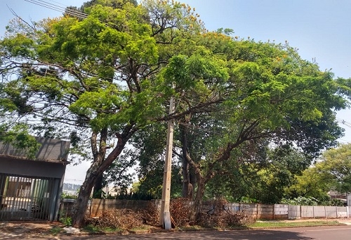 "Situação da iluminação de led na rua Mamborê, no centro de Campo Mourão. Será que precisa podar as duas árvores?"