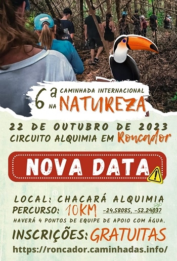 A 6ª Caminhada Internacional na Natureza de Roncador, que seria realizada neste domingo, foi adiada para o próximo dia 22. Motivo? Previsão de muita chuva no dia 8. O evento já tinha mais de 200 inscrições. O circuito Alquimia tem 10 km entre trilhas e estradas rurais. Para este mês também está marcada a Caminhada Internacional na Natureza de Janiópolis, como Circuito das Corredeiras. Será no dia 29.