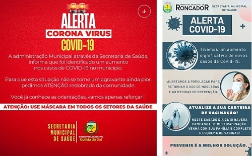 Duas prefeituras da região usaram as redes sociais nas últimas horas para divulgar alertas contra o aumento de casos de coronavírus. Em Roncador, a Secretaria de Saúde chegou a pedir que a população volte a usar máscaras e as medidas de prevenção. Em Quinta do Sol, o alerta pede atenção redobrada da comunidade e recomenda o uso de máscaras em todos os setores de saúde. "Você já conhece as orientações, vamos apenas reforçar", destaca a postagem da prefeitura.