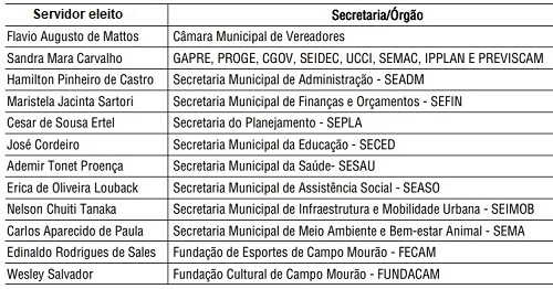 A prefeitura de Campo Mourão divulgou nesta sexta-feira, no Órgão Oficial, a relação dos 12 funcionários municipais que foram eleitos "Servidores do Ano 2023". Onze representam secretariais da prefeiura e um a Câmara de Vereadores. A escolha é por votação dos servidores. A eleição faz parte das comemorações pelo Dia do Servidor Municipal (28 de outubro).