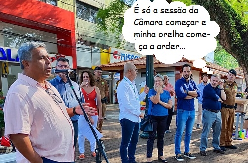 O clic é da manhã desta segunda-feira, quando um evento no calçadão marcou o encerramento da Semana no Trânsito em Campo Mourão. O secretário de Mobilidade Urbana, Ireno dos Reis Pereira, discursa e o prefeito Tauillo Tezelli acompanha. Nenhum vereador participou porque foi bem no horário da sessão da Câmara...