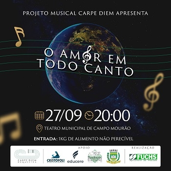 O projeto Orquestra Carpe Diem volta a se apresentar no Teatro Municipal de Campo Mourão. Será nesta quarta-feira (20h), com "O amor em todo canto". "Cantaremos o amor em vários aspectos, ritmos e idiomas", anuncia. A entrada custa 1kg de alimento (não é preciso retirar ingresso).