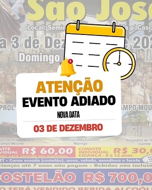 O Costelão de São José, que seria realizado no próximo domingo, foi transferido para o dia 3 de dezembro. O anúncio foi feito pela Diocese de Campo Mourão por causa da morte do padre João Donizetti Pitondo. Ele era o reitor do seminário e um dos organizadores da festa. O costelão segue à venda por R$ 700 (o convite individual sai por R$ 60).
