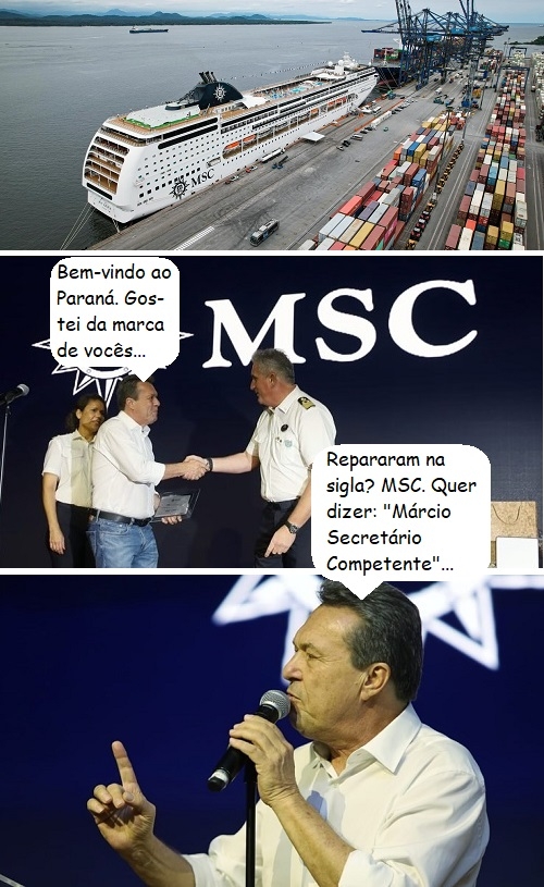 Os cliques são desta sexta-feira, no Porto de Paranaguá, quando aconteceu o primeiro embarque de cruzeiro em solo paranaense. Foi através de parceria entre o governo do Estado e a MSC Cruzeiros. O secretário de Estado do Turismo, Marcio Nunes, estava lá. ’ Além do embarque, a passagem de turistas estrangeiros promete gerar trabalho e renda, movimentando a economia do litoral”, destacou.