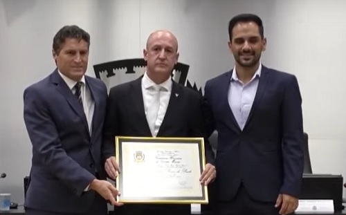 Teve sessão solene neste sábado à noite na Câmara de Campo Mourão. Foi para a entrega do título de Cidadão Honorário ao advogado e professor Robervani Pierin do Prado, ex-procurador geral da prefeitura. A homenagem foi entregue pelo vereador autor, Bina Teixeira, e pelo coordenador geral da prefeitura, Sérgio Henrique dos Santos. Sete vereadores participaram da sessão, que também teve a presença do deputado Douglas Fabrício.
