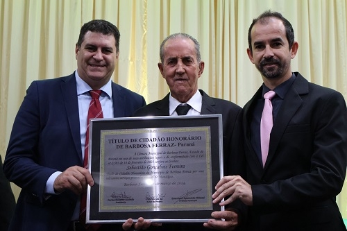 Barbosa Ferraz – O ex-vereador Tião da Breda recebeu o título de Cidadão Honorário. A homenagem foi entregue pelo vereador autor, Fabrício de Sá, e pelo prefeito Edenilson Miliossi.