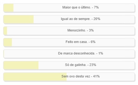 “Como será a Páscoa deste ano?” Se depender de quem votou na enquete de Boca Santa, o coelhinho teve pouco serviço. A alternativa ais votada foi a “Sem ovos desta vez”, com 41% dos votos. “Só de galinha” ficou em segundo, com 23%. “Igual ao de sempre” ficou em terceiro, com 20%. Apenas 7% votaram em “Maior que o último”. O resultado completo está no quadro acima.