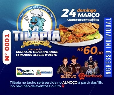 A prefeitura de Rancho Alegre do Oeste confirmou a volta do prato típico na programação da festa pelos 32 anos de emancipação do município. A tilápia no tacho será servida no almoço do dia 24 de março. Os ingressos já estão à venda por R$ 60. A Expo-Rancho será realizada entre os dias 22 e 24. A programação incluiu shows com Jads & Jadson, Fiduma & Jeca e Pedro Paulo & Alex, além de rodeio.