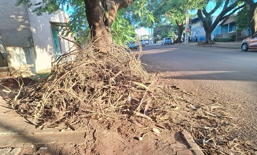 “Isso foi o que sobrou de um galho grande que caiu no último dia 8 (rua São José, abaixo da Tancredo). Vieram desobstruir e foram deixando restos, serviço não feito corretamente, só o principal”.