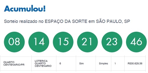 Ninguém acertou as seis dezenas da Mega Sena que foram sorteadas na quinta-feira. Assim, o prêmio de R$ 12 milhões ficou acumulado para este sábado, quando deve chegar a R$ 16 milhões. A quina teve 49 apostas ganhadoras e cada uma levou R$ 30,6 mil. Do Paraná são duas, sendo uma delas de Quarto Centenário, feita na lotérica com o nome da cidade.